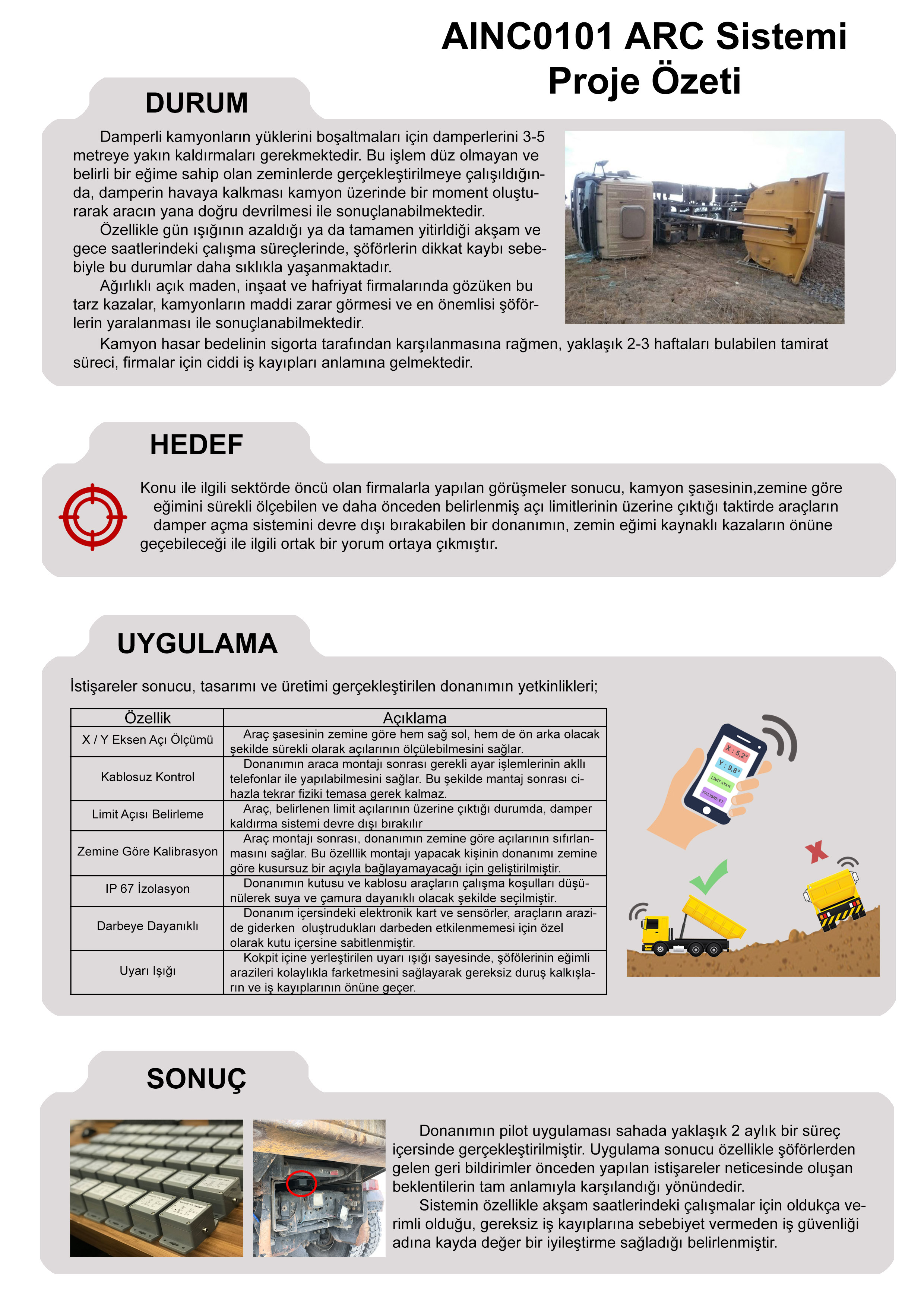Sektör liderleriyle yapılan görüşmelerde, şasi eğiminin anlık ölçümü ve önceden belirlenen limit aşıldığında damper kalkışının otomatik kilitlenmesi gerektiği ortaya çıktı. Çözüm ayrıca sahada hızlı kalibrasyon ve plaka/araç bazlı yönetim sunmalıydı.